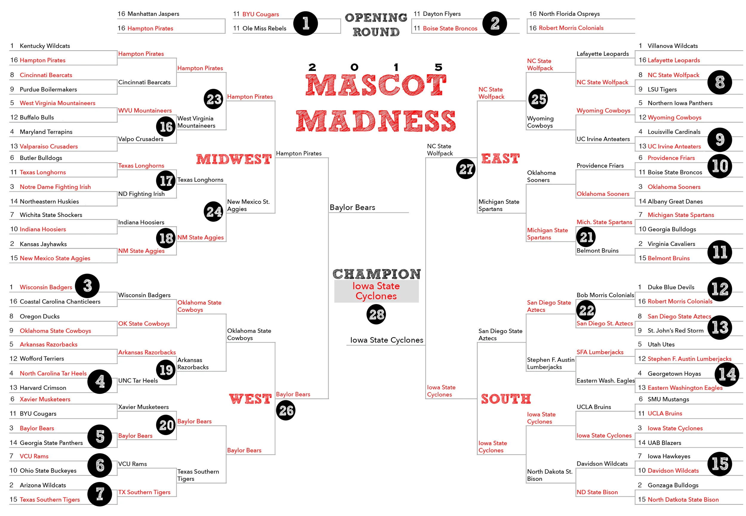 28. For the 4th consecutive year, the Cyclones make the Final Four and, thanks to no team with any variation of Hurricane making the NCAA Tournament this year, Iowa State grabs the Mascot Madness crown for the first time since 2012. Congrats to all this year’s participants. Cue up Luther Vandross.