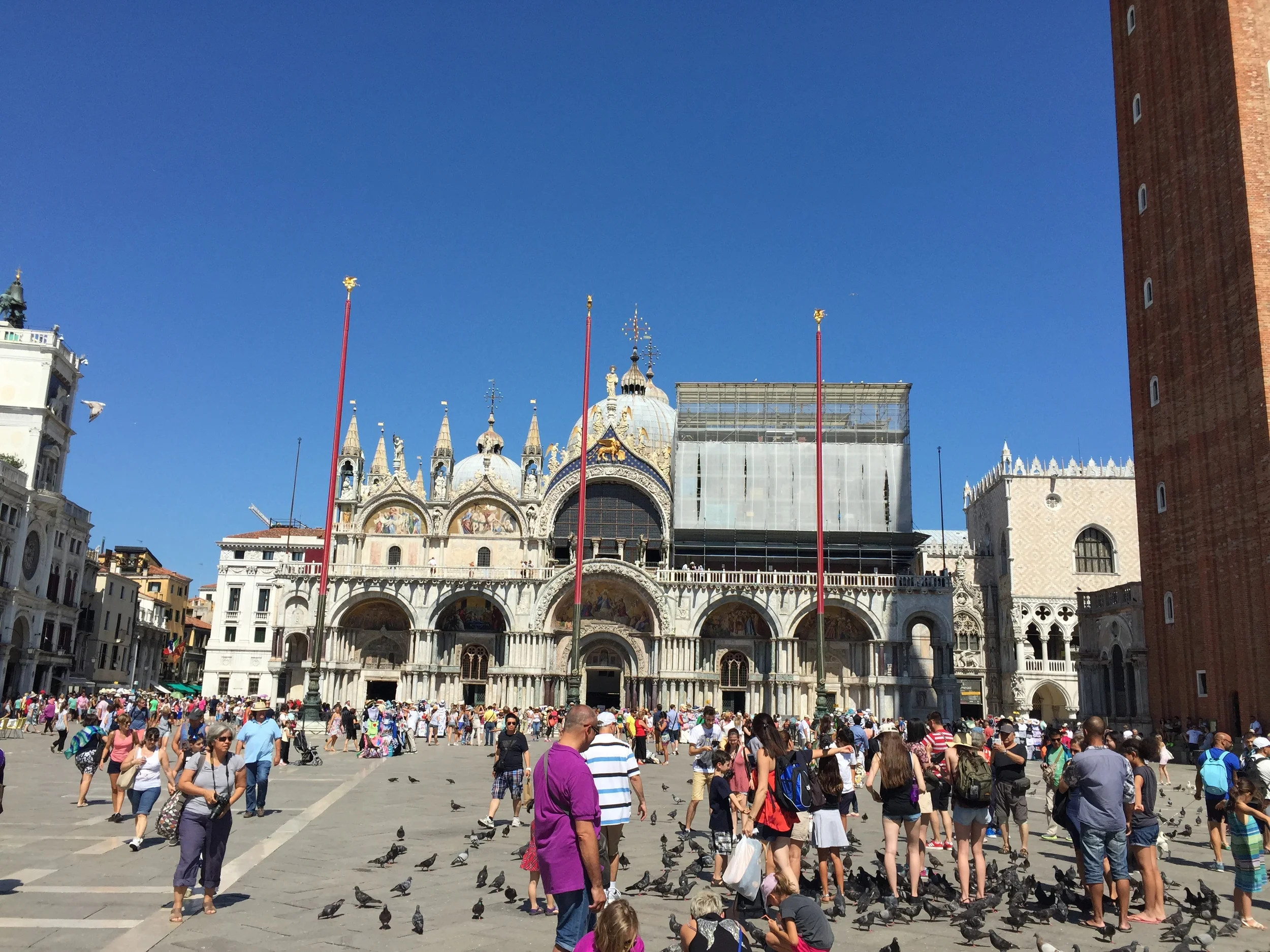 When we arrived in Venice at the train station, we hopped a vaporetto (water taxi) that took us down the Grand Canal, and then we navigated our way to our hotel. After we got settled, we set out on a short walk to the Basilica of St. Mark. This is where the word ridiculous comes back into play though not in as glowing terms.